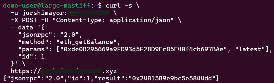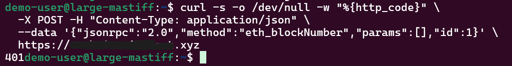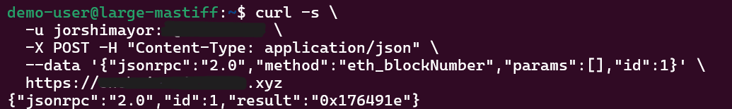 This is the simplest end-to-end health check. It confirms that your credentials are accepted, NGINX is forwarding requests to Geth, and Geth is synced and responding.