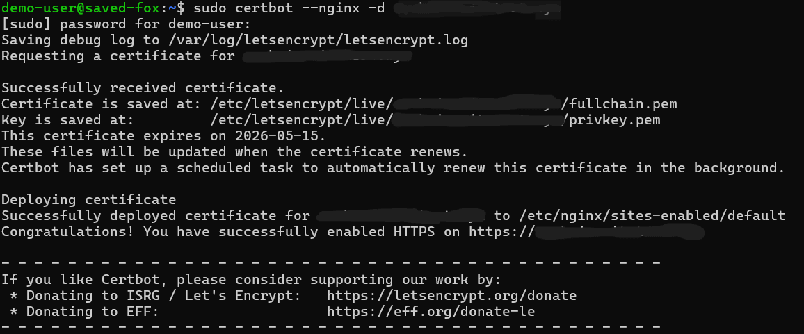 sudo certbot --nginx -d YOUR-DOMAIN-ADDRESS