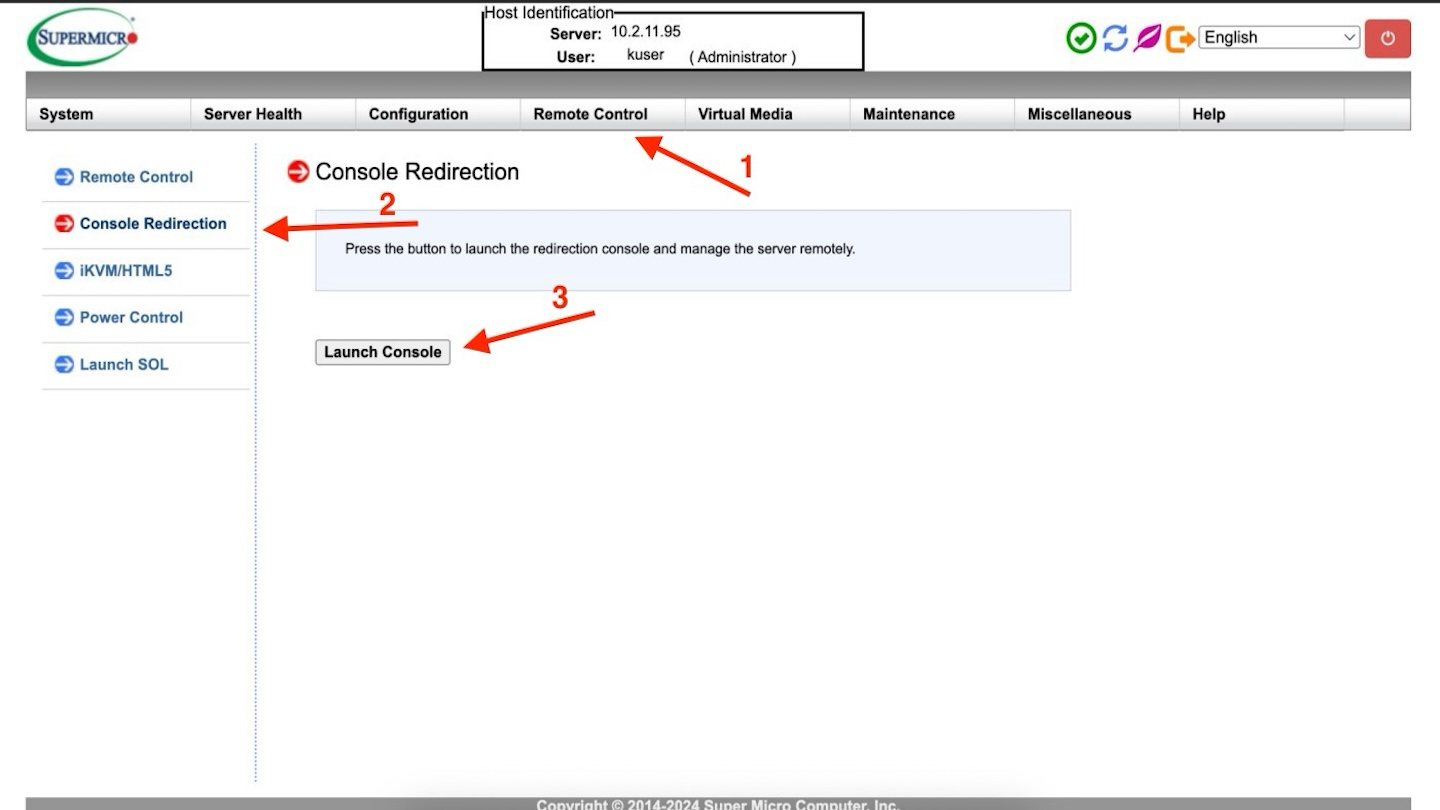 Once you are logged in to the Supermicro management interface, look at the top menu and select Remote Control. On the left sidebar, click Console Redirection. This section has a Launch Console click it to download the .jnlp file.