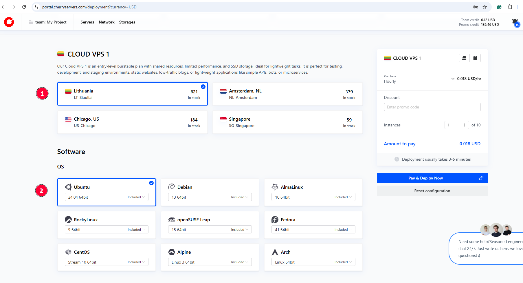 In the next section, select the preferred geographical location for the VPS and the operating system. Cherry Servers provides cloud servers in six primary regions: Lithuania, the Netherlands, Sweden, Germany (Frankfurt), the USA (specifically Chicago), and Singapore.