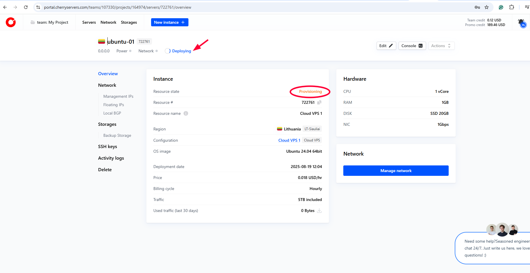 For demonstration, our chosen plan is a $6.32/month VPS with 1 vCPU, 1GB RAM, 20GB SSD, and 1 Gbps bandwidth.