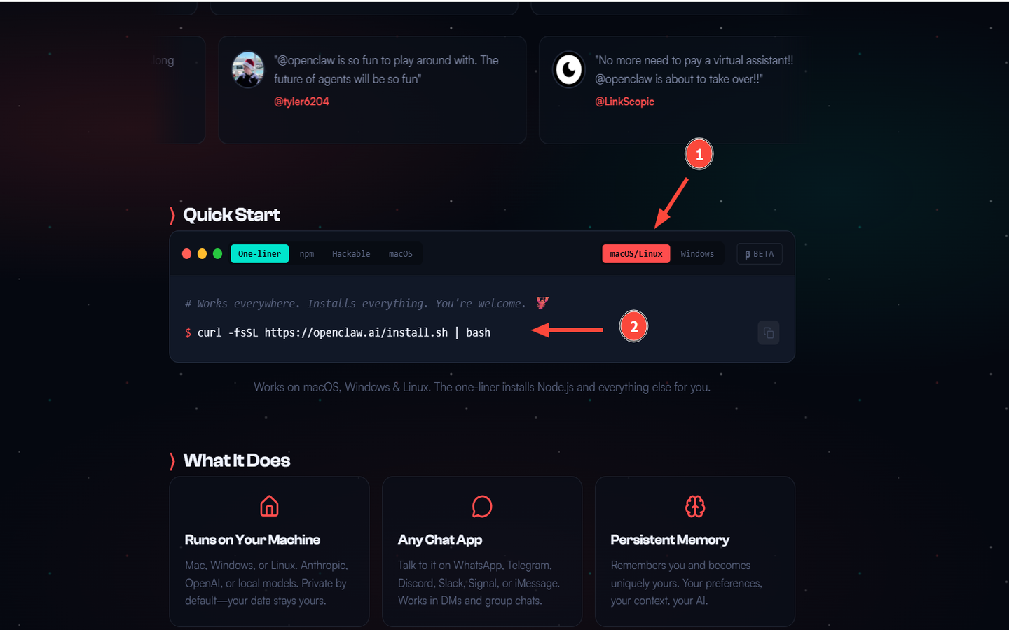 To proceed, visit OpenClaw’s website and navigate to the Quick Start section. Click change, then select the macOS/Linux option.