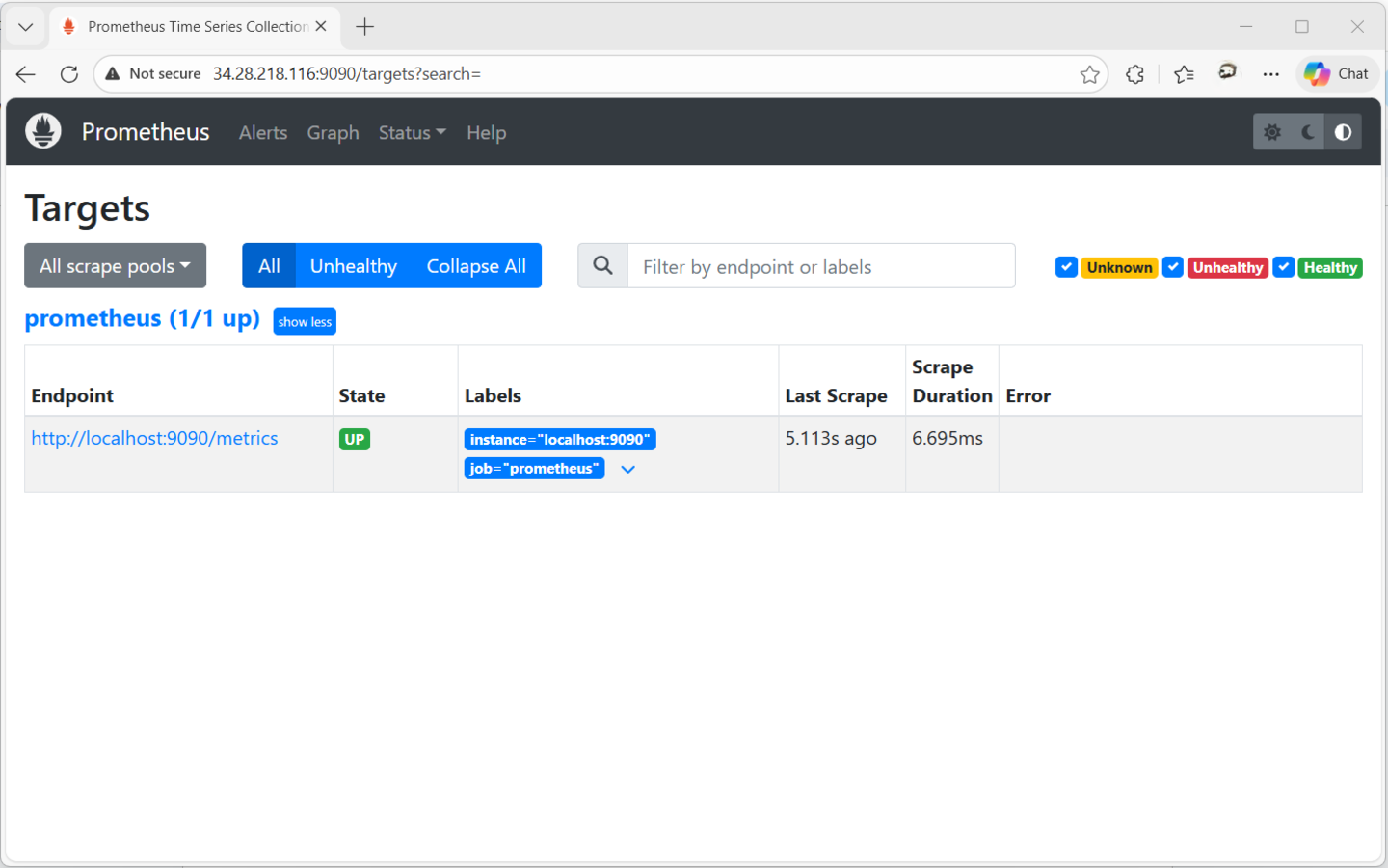 To check configured endpoints, head to Status > Targets. This section displays all targets and their current status. Currently, only one endpoint is configured as shown.