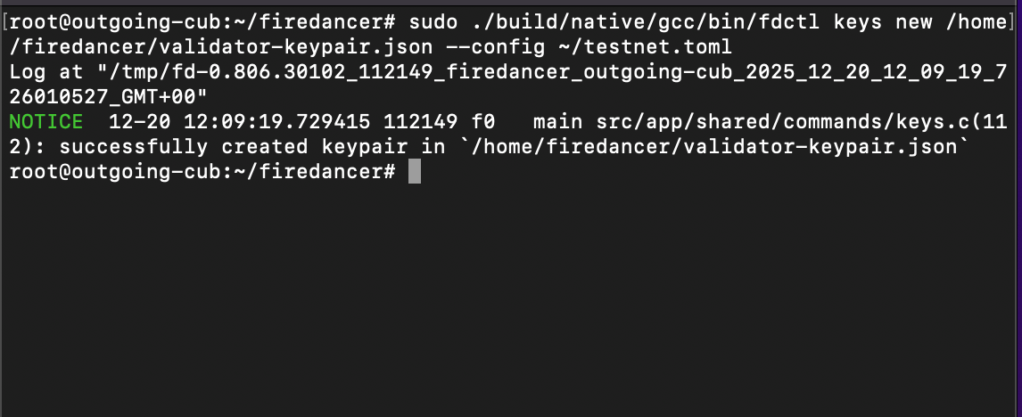 sudo ./build/native/gcc/bin/fdctl keys new /home/firedancer/validator-keypair.json --config ~/testnet.toml