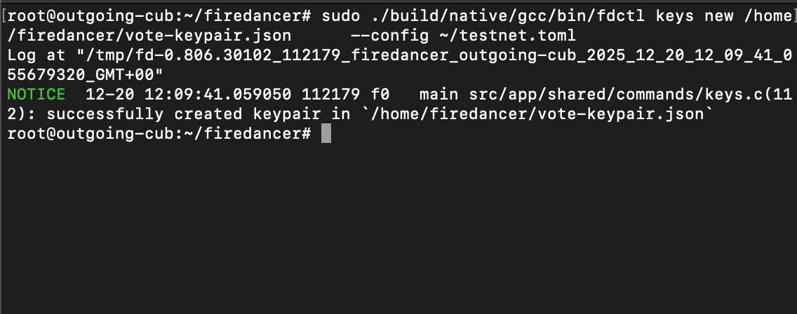 sudo ./build/native/gcc/bin/fdctl keys new /home/firedancer/vote-keypair.json --config ~/testnet.toml
