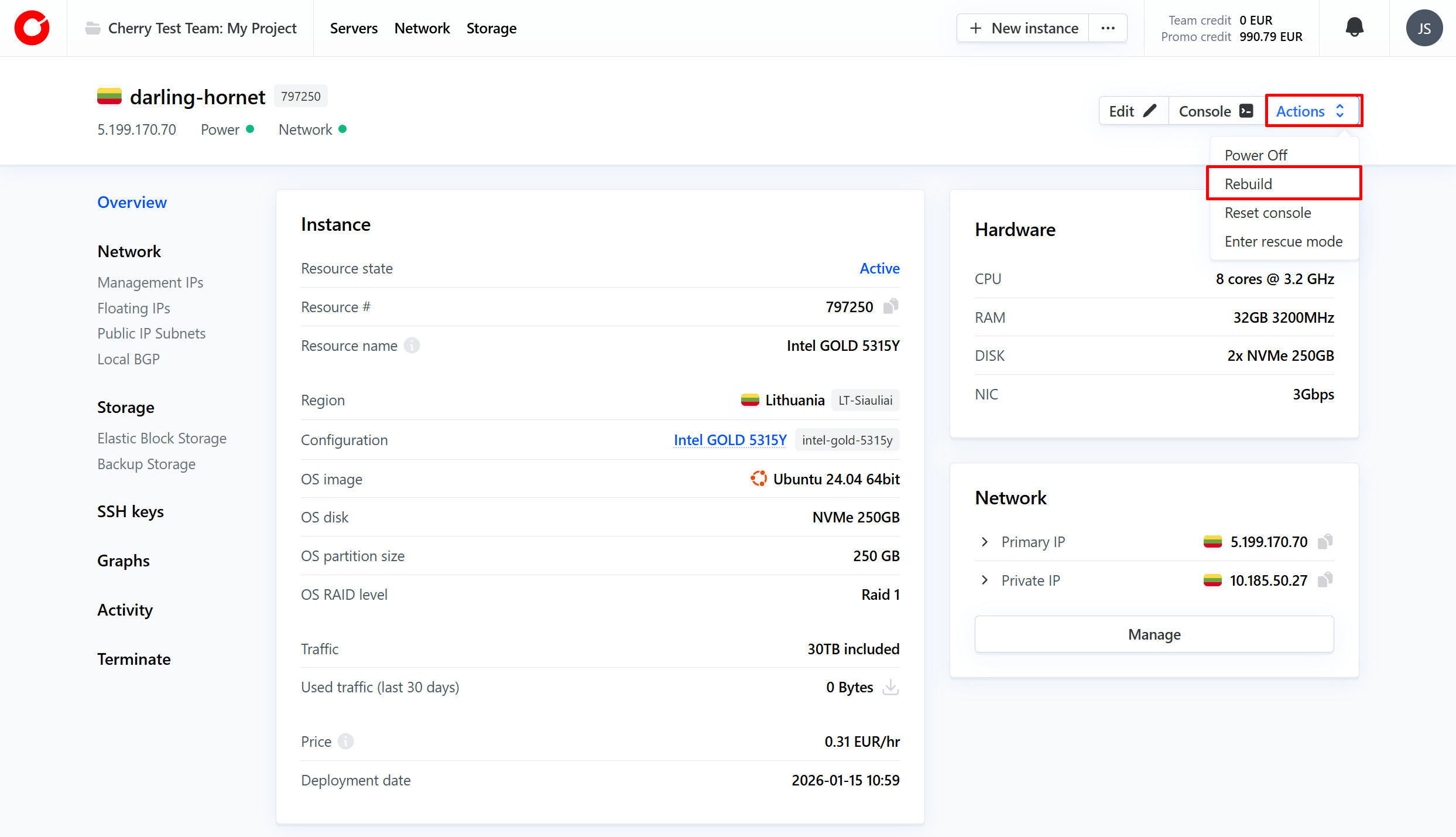 Select the server you would like to rebuild. In the top right hand corner, click “Actions” and select “Rebuild”.