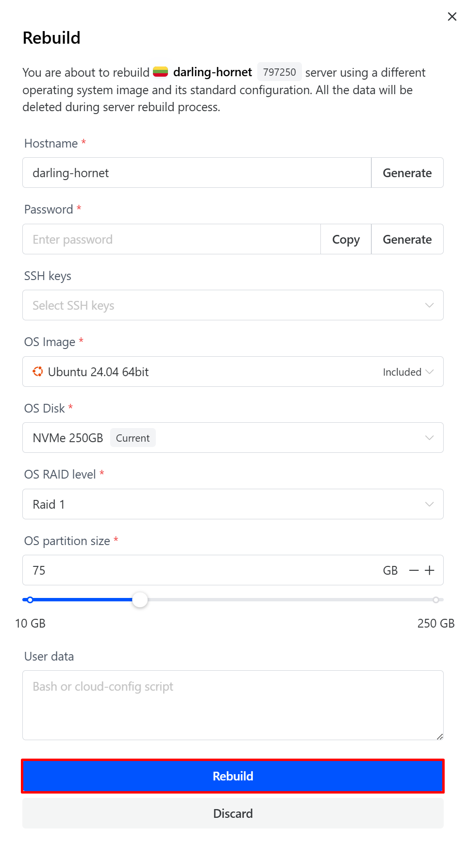 Cherry Servers deployments dedicate all disk or RAID storage space to the operating system by default. The custom partitioning layout allows you to adjust the default operating system (OS) partition size upon server deployment or rebuild, to a minimum of 10GB.