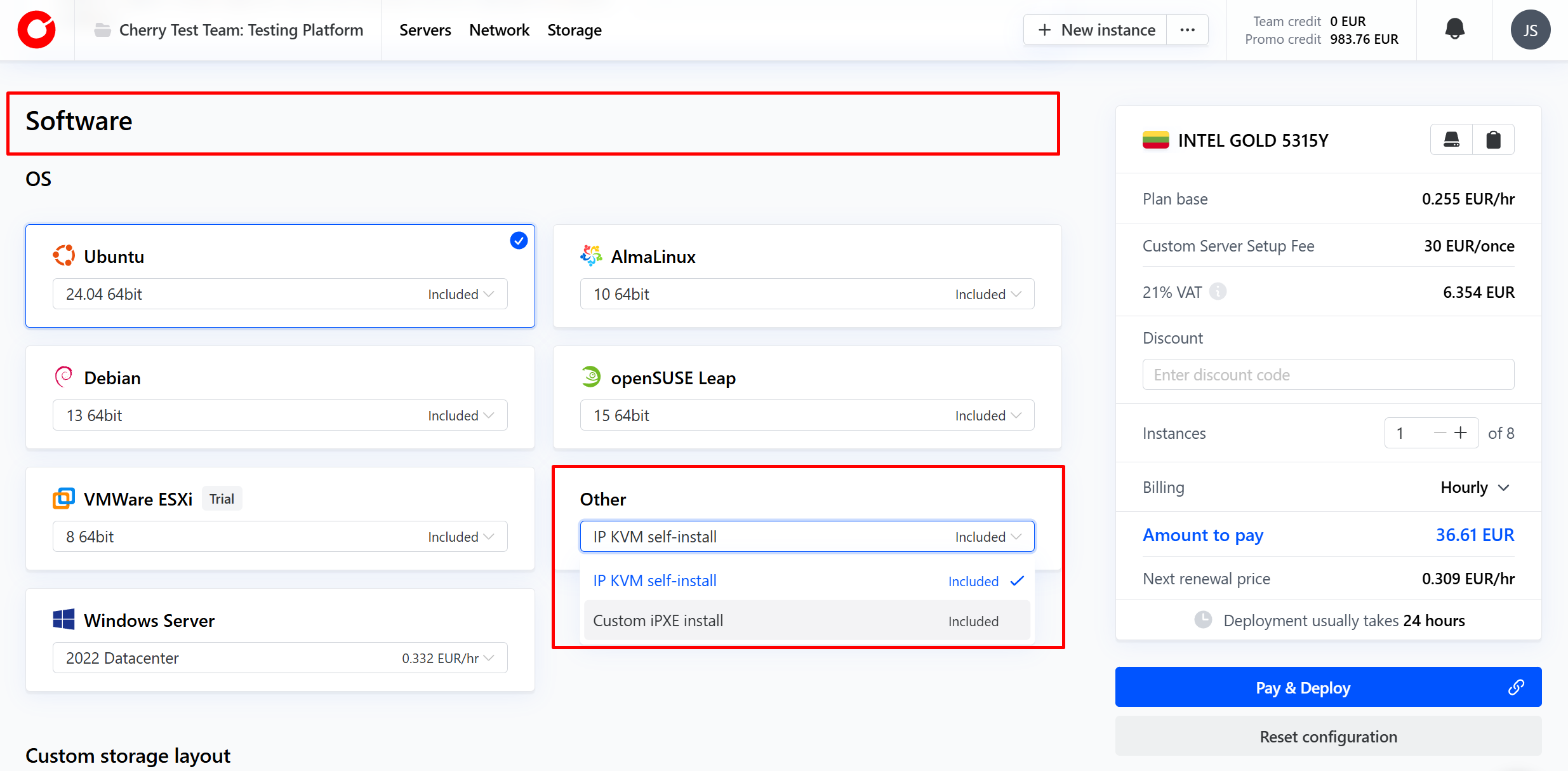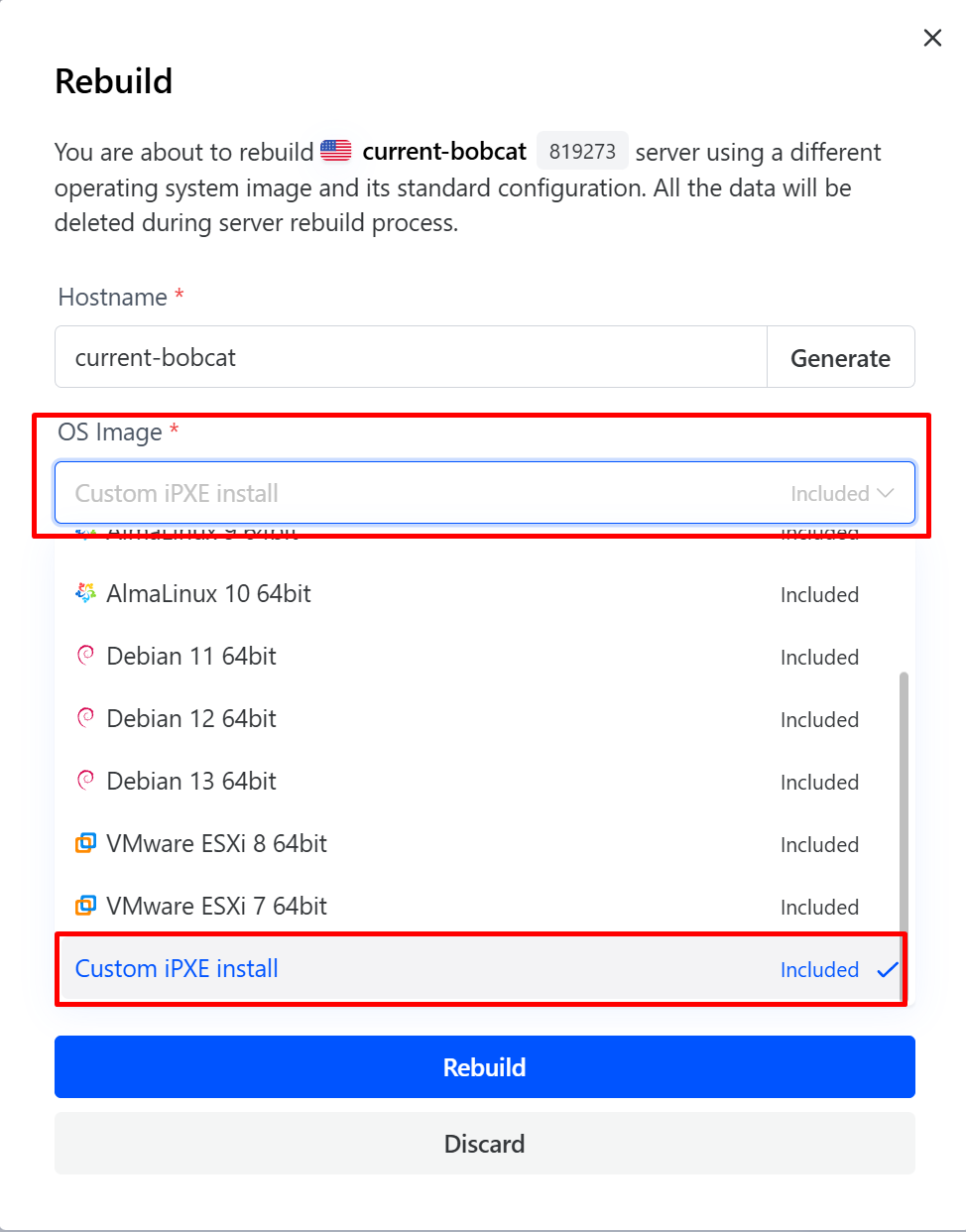 iPXE can be used for any dedicated bare metal server, excluding those in the “Outlet” category, during server deployment, or even on live servers by performing a server rebuild. Below are instructions to select iPXE in both cases, followed by an overview of implementing the script.