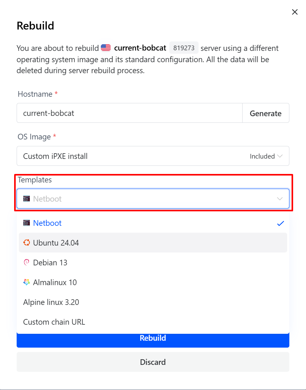 From the dropdown menu, you can choose to use one of the prepared templates for an OS that Cherry Servers officially supports, netboot, or opt to use a custom chain URL.