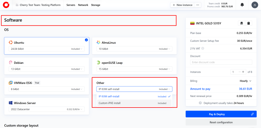 After selecting the server, the page will direct you to configuration settings. Scroll down to the “Software” section and engage the dropdown menu in the “Other” box. Select “Custom iPXE install”.