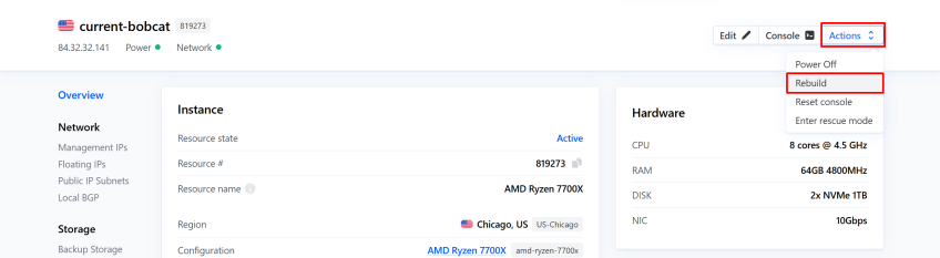On the server dashboard, click the “Actions” button in the top right-hand corner, and select “Rebuild” from the dropdown menu.