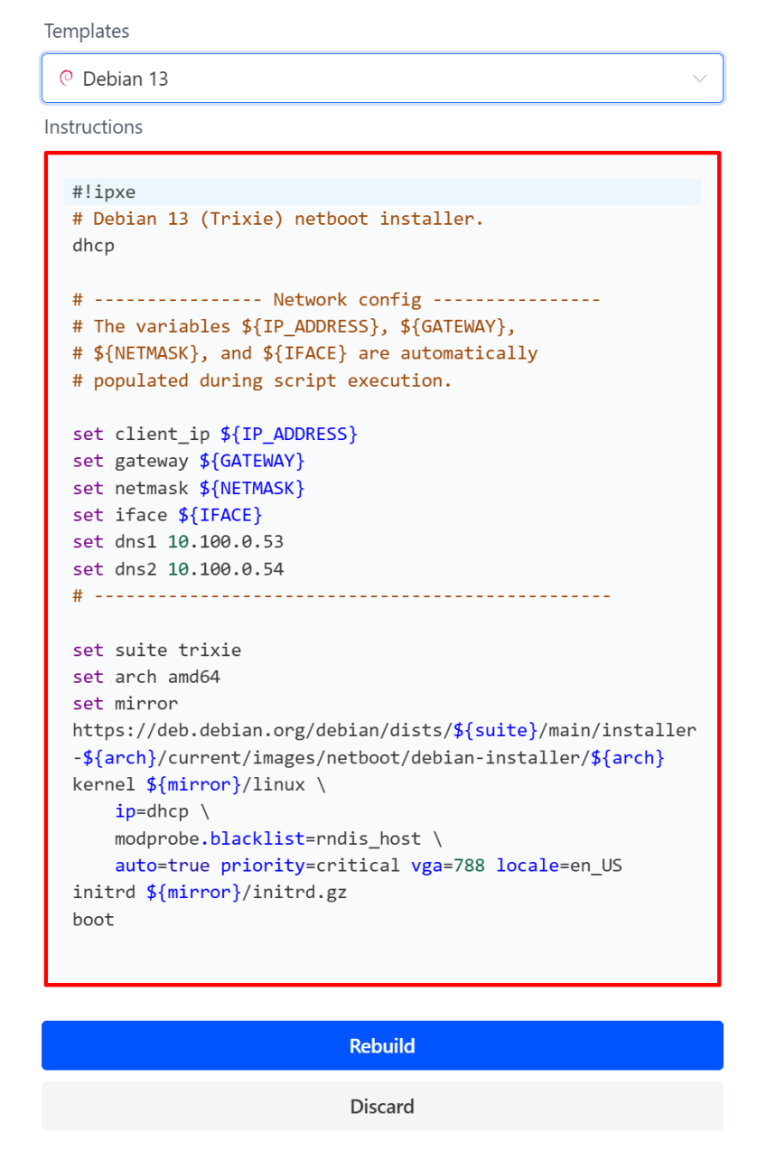 Once Custom iPXE install has been selected, a new box titled “Templates” will appear, along with an “Instructions” box.