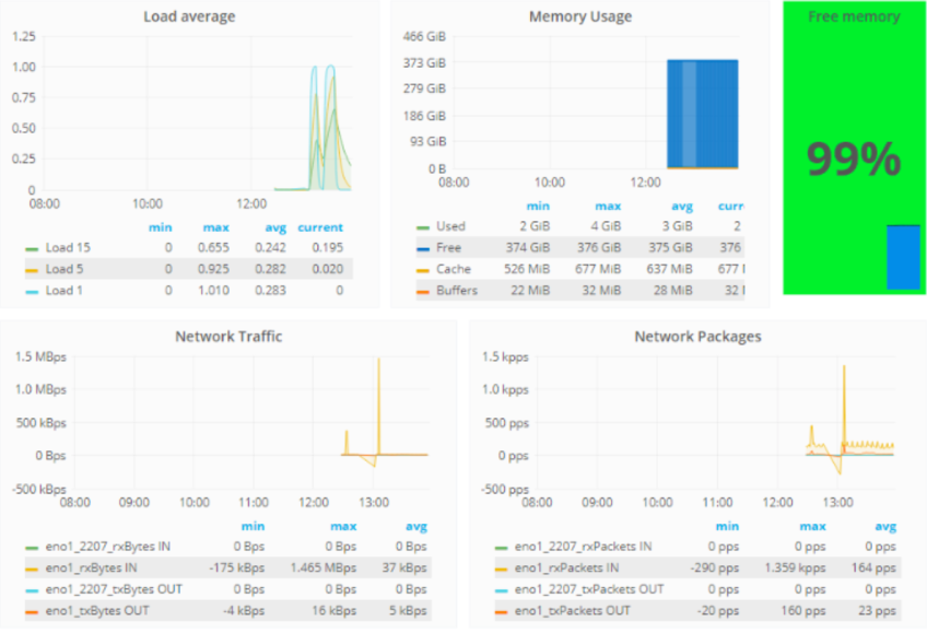 Every Linux-based bare metal server comes with a pre-installed Sensu monitoring agent that tracks the server’s CPU, memory, network, and disk activity. You may check these metrics in real-time in your client portal by clicking on the server you would like to monitor, and selecting "Graphs" in the left section.