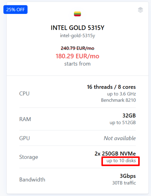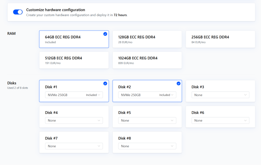Each of our instant server configurations is equipped with two NVMe storage disks included in the base price by default. These default disks can be changed, however they will no longer be included in the base server price. Additional disks can be attached, up to a maximum indicated in grey text as shown in the image below. The possible maximum storage disks will be either three, four, six, eight, or ten, depending on the chosen CPU.
