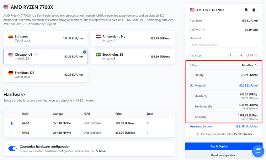 - Select the number of instances you would like to deploy, and your preferred billing period.