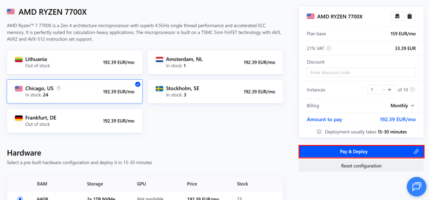 - Click “Pay and Deploy”. Our technicians will begin working to configure your hardware and deploy as quickly as possible.