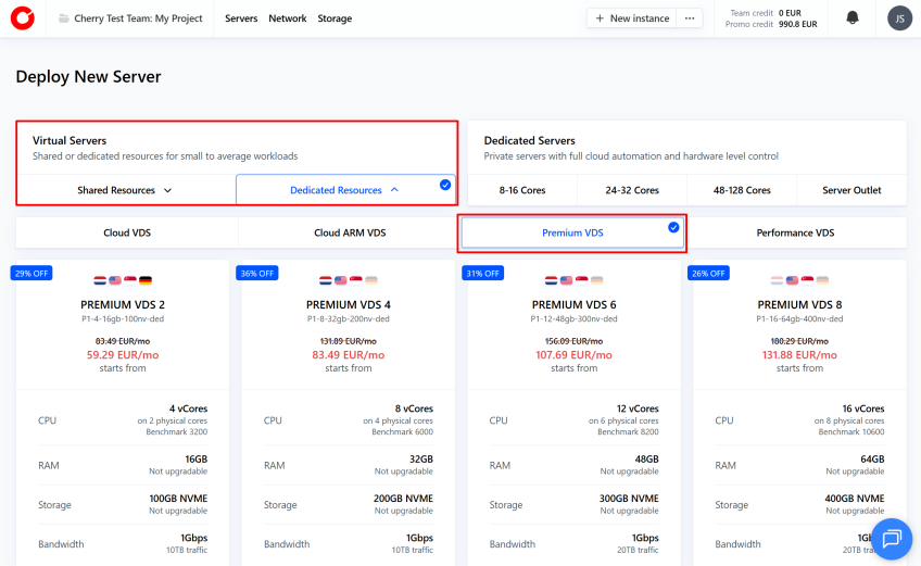 You can view our available Premium VDS servers by clicking the “Dedicated Resources” tab under the “Virtual Servers” heading on the deployment page, as shown in the image below.