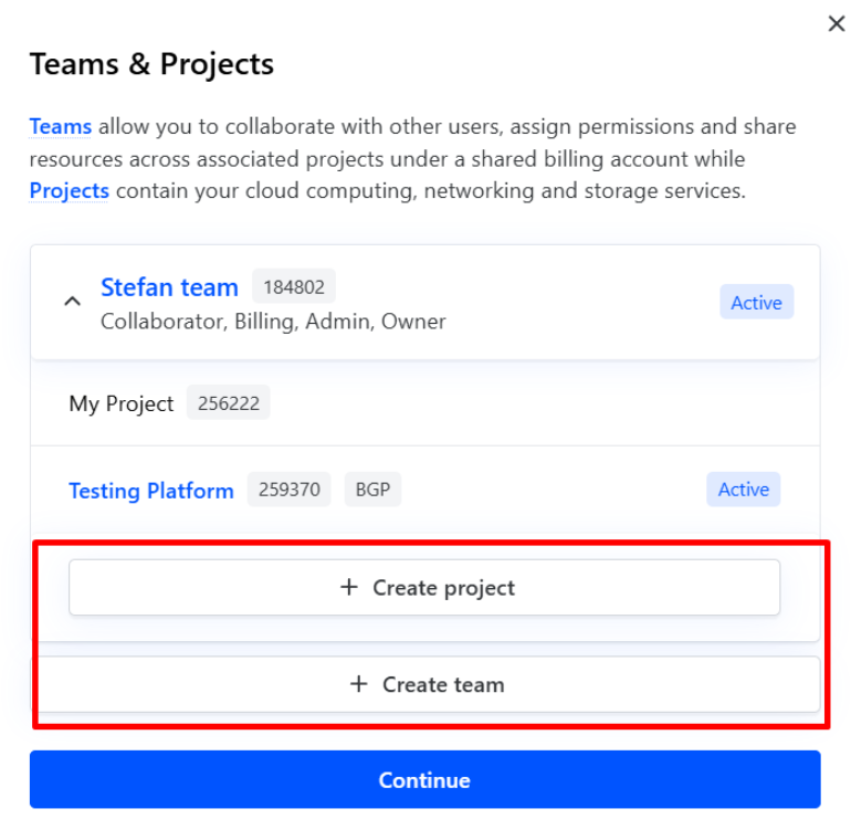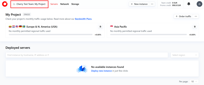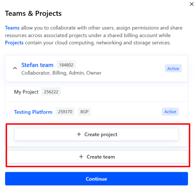 With Cherry Servers, you can manage your entire workflow through the client portal. Accounts, teams and projects are the three main segments that help you keep everything organized in separate, clear, and easy to understand groups. When you create an account at Cherry Servers, a single team and a single project are created and linked to the account by default. All new services you order are assigned automatically to this default project. Each user account can create and be linked to any number of teams, while a team can be connected to any number of projects, but each project may only connect to one team.