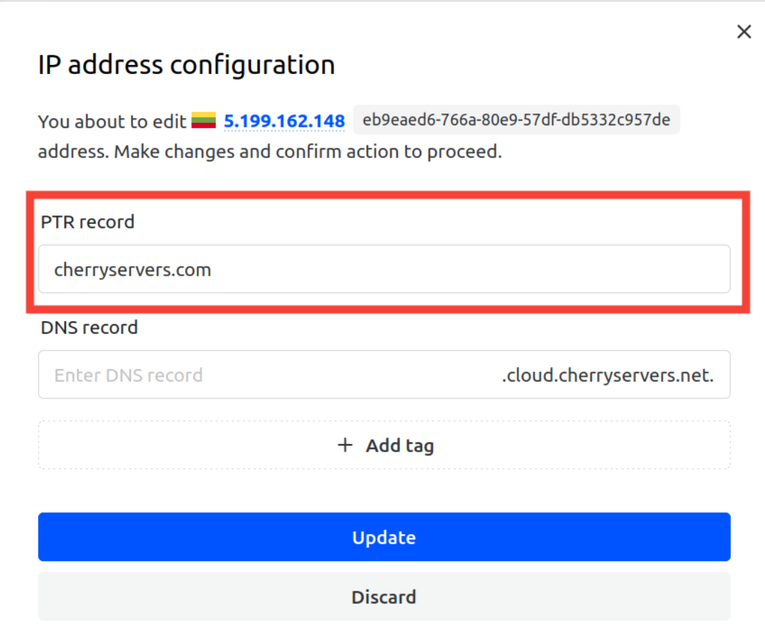 Now you have successfully set the rDNS (PTR) record on your Cherry Servers. Properly configured PTR records improve the reliability of your server’s overall internet presence, including crucial functions like email delivery.