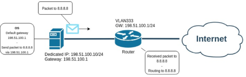 Cherry Servers management IPs are assigned with an additional gateway IP address, providing the server with a default destination route through which to send packets. When a server needs to send information, it will first check its routing table for the default route, via the gateway IP. The packet is sent to this gateway, and the router it belongs to forwards the packet onto the internet and to the DNS server, which then provides a response.