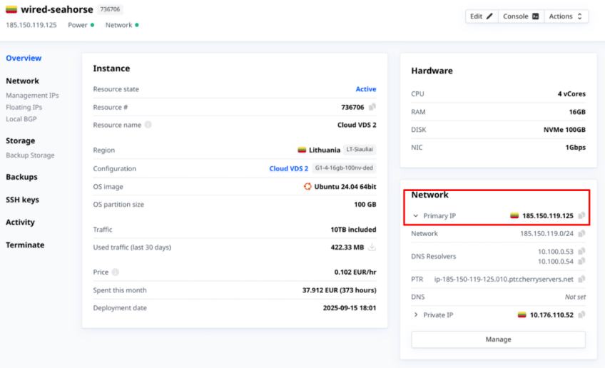 An overview will be provided on the right-hand side in a box labeled “Network”. The Management IP is listed here as the server’s “Primary IP”.