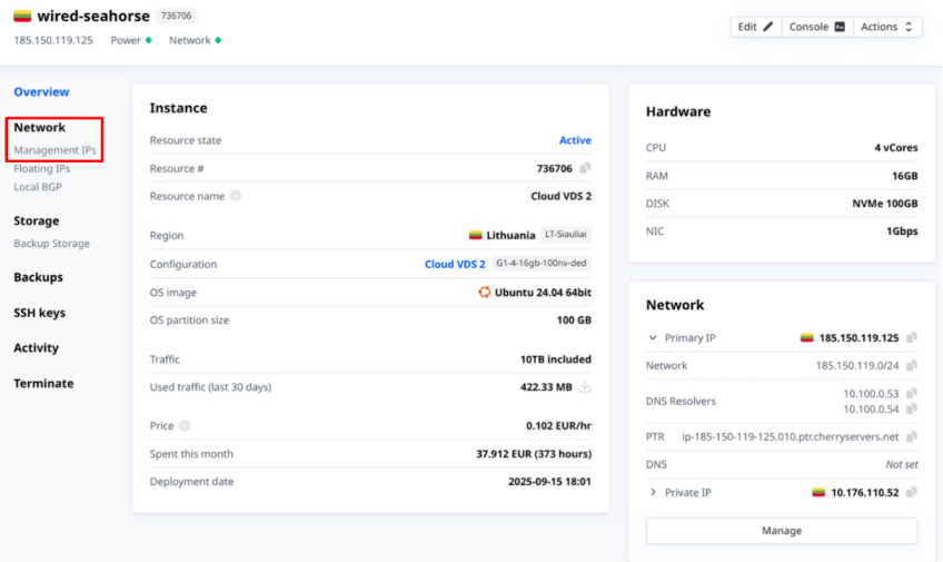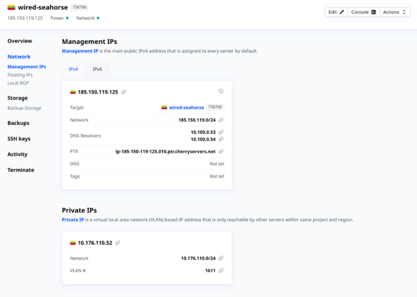Each dedicated and virtual dedicated server is deployed with a public IPv4 address assigned to administrative access. This is known as the Management IP. This IP address provides administrators with a secure pathway to connect to the server’s operating system management interface, which is entirely separated from public operational traffic.