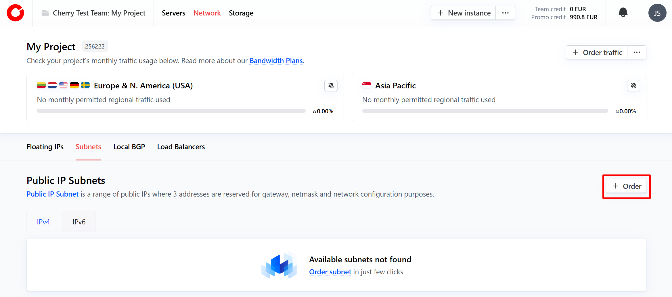 Select the region of the server you would like the subnet to operate in, and the subnet range you need, and click “Order”.