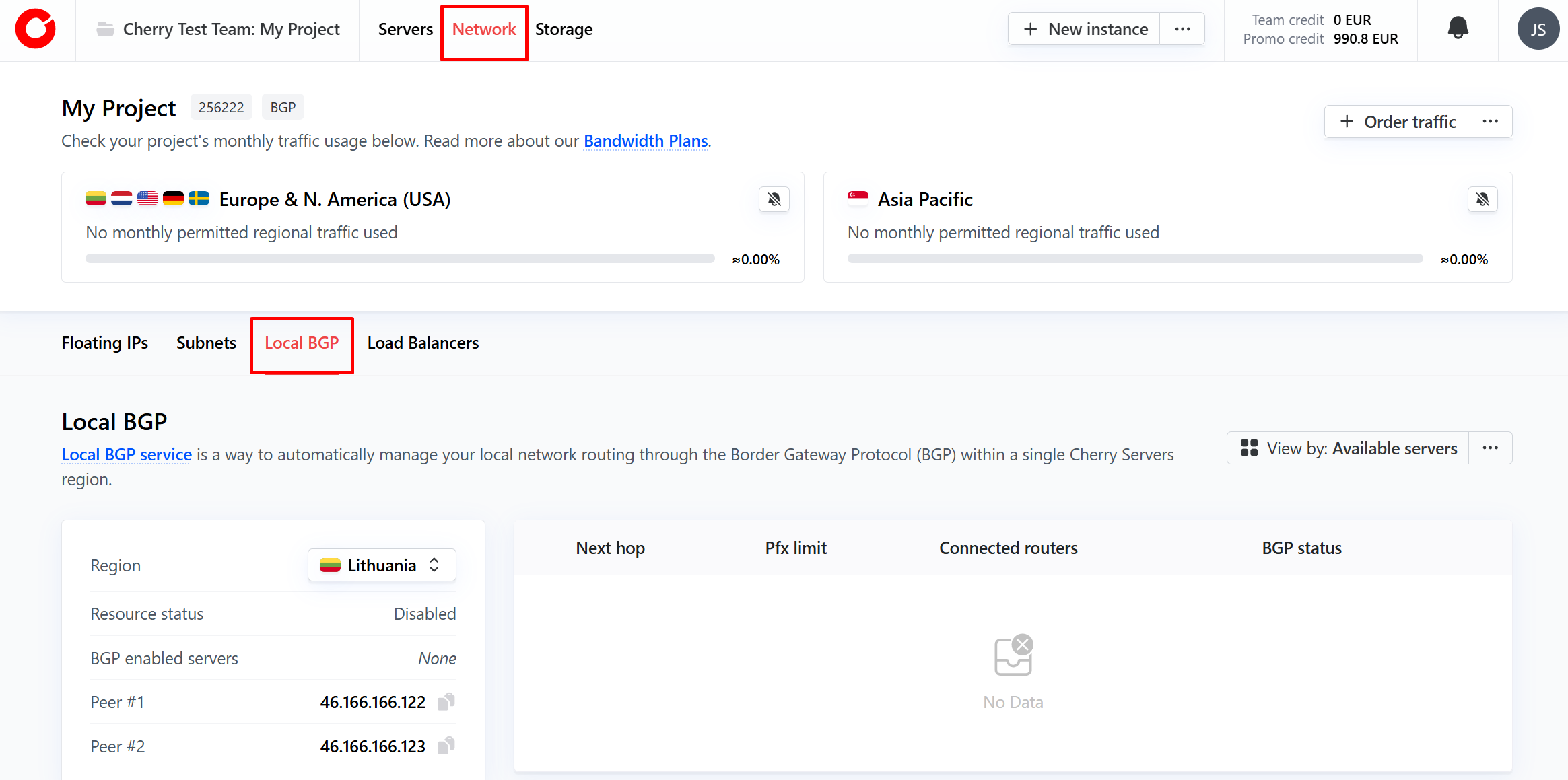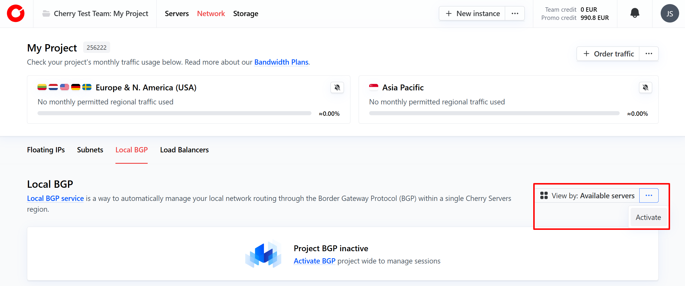 Local BGP is activated at a project level and provides service to all servers in the same region once configured. The service can be enabled for both new and existing projects on the client portal in one of two ways: