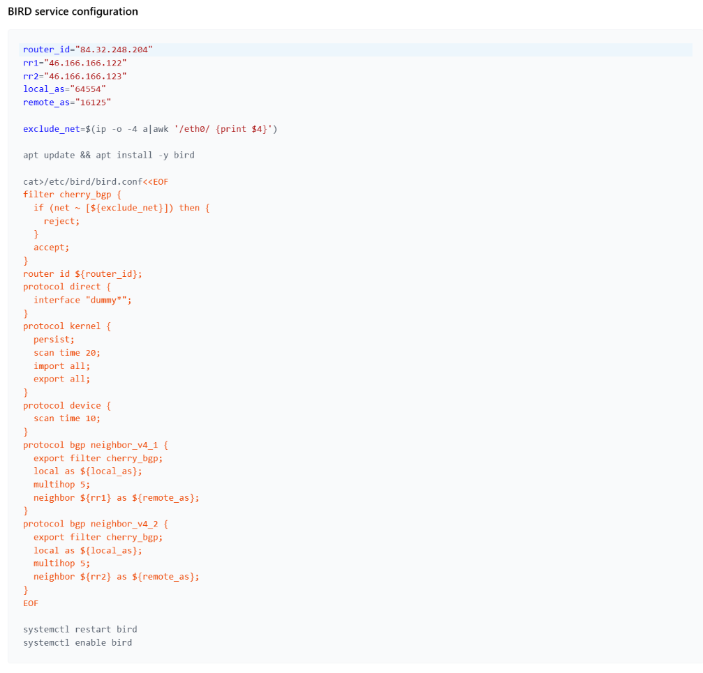 These instructions are specific to your selected operating system. Copy these commands and execute them in your selected server to install and configure BIRD service with the necessary variables.