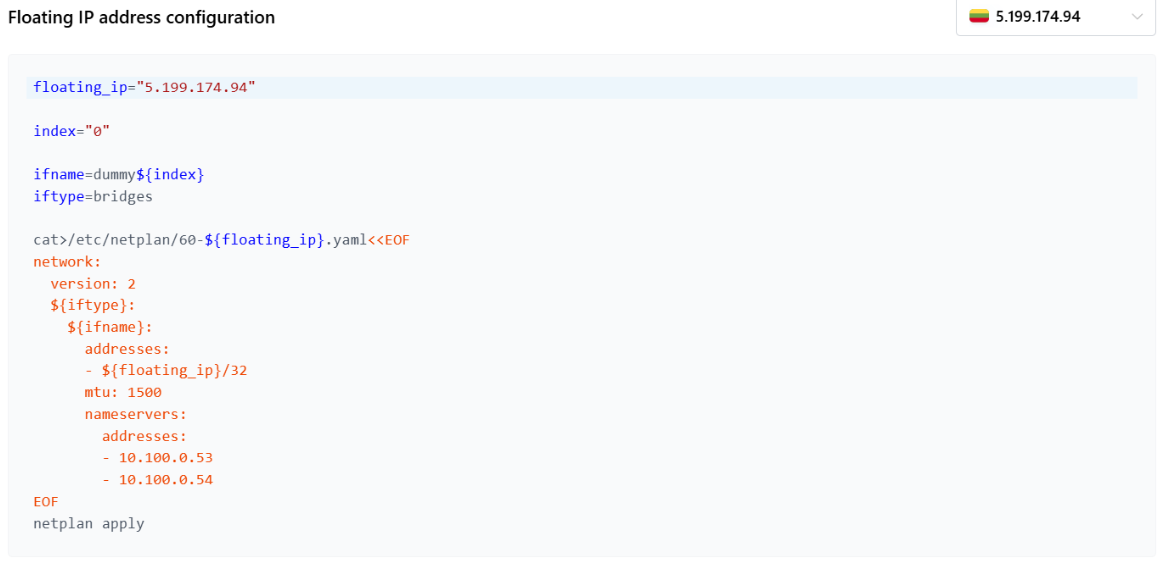 The third table contains “Floating IP address configuration” commands. These instructions are specific to your selected operating system, and you may select which Floating IP to configure from the dropdown menu. Copy these commands and execute them in your selected server to install and configure BIRD service with the necessary variables.