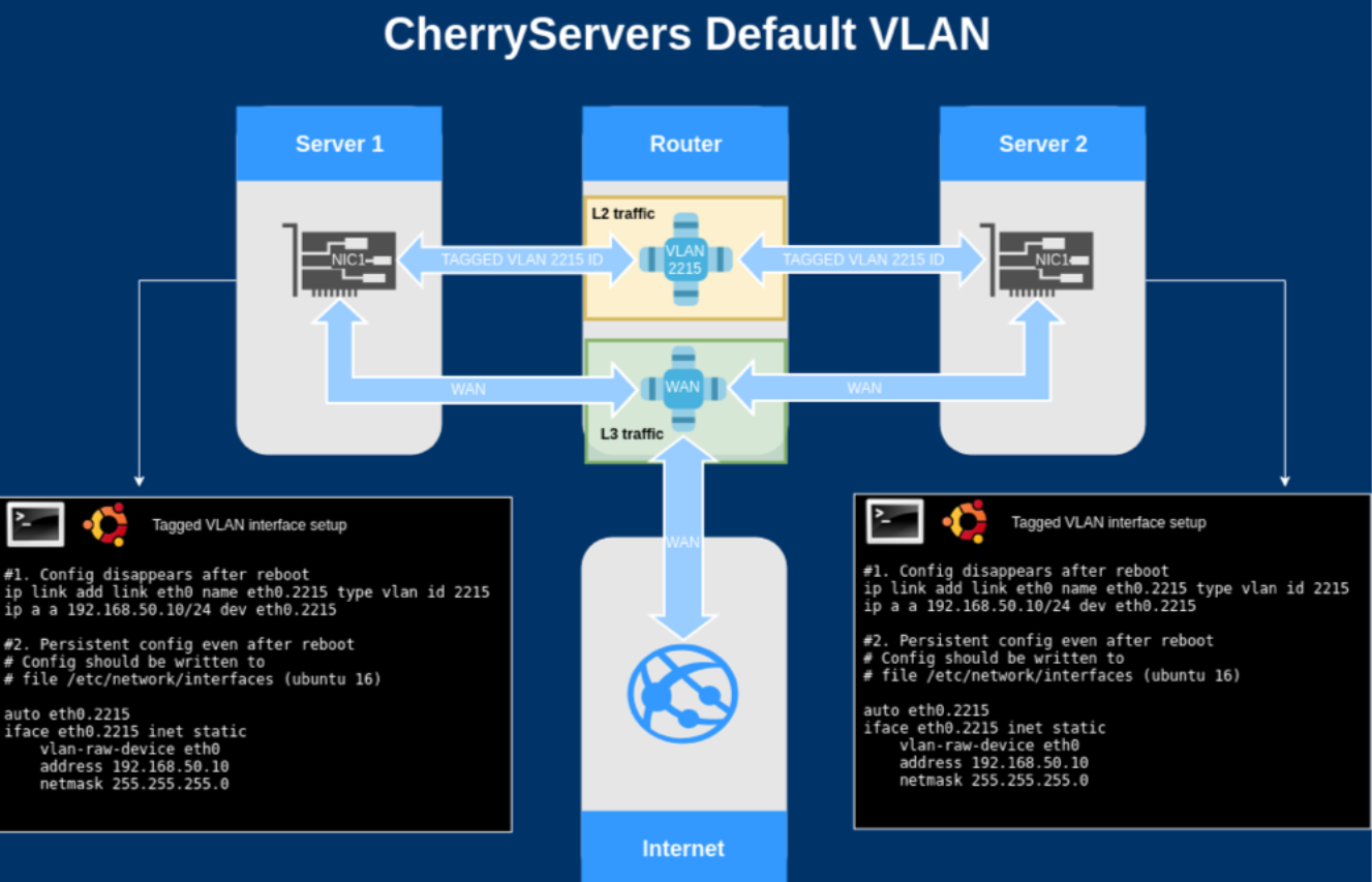 A private VLAN subnet uses the main network card interface of the server, which is also used for routing public traffic. However, Private VLAN traffic is marked by a special VLAN ID, which is assigned upon deploying a new server. This enables the Cherry Servers network to easily differentiate and separate private VLAN traffic from public traffic, despite both coming to the same network interface card.
