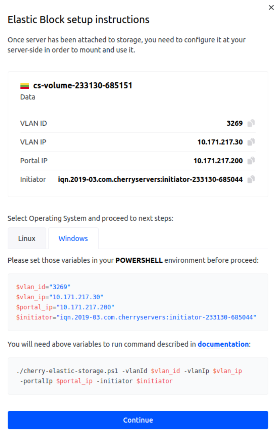 wget -OutFile cherry-elastic-storage.ps1 https://raw.githubusercontent.com/cherryser - After attaching the volume, the Elastic Block setup instructions popup window appears in the Client Portal. It contains four variables you will need to accurately copy for the script: