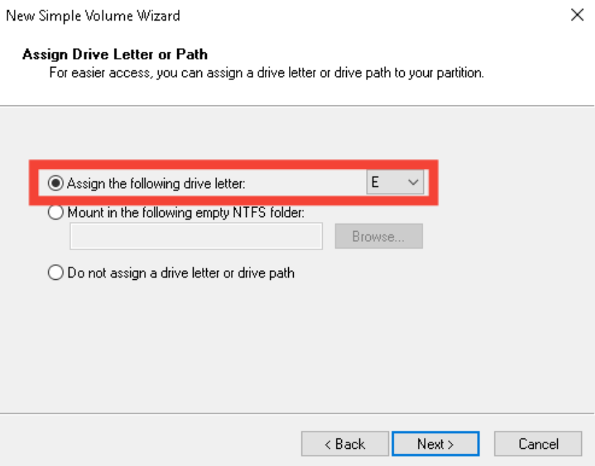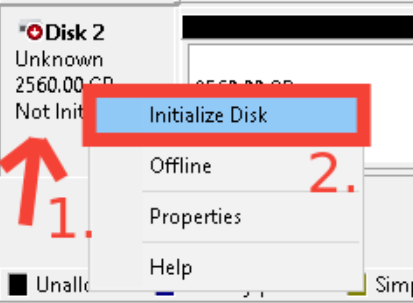 - Once the disk has been initialized, right-click the unallocated space to the right of the disk and choose “New Simple Volume”. Follow the wizard to: