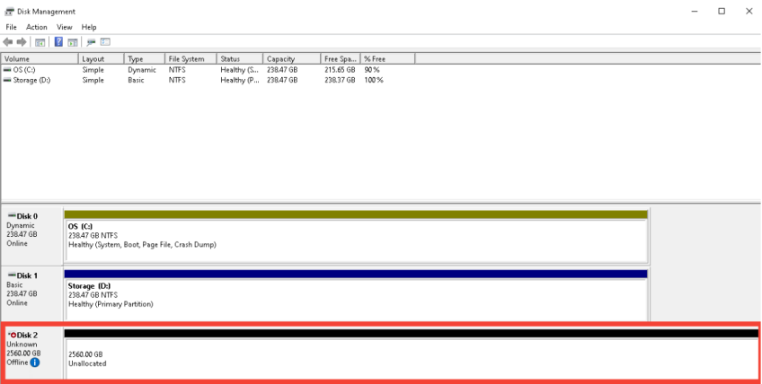 - In the lower section of the Disk Management window, locate the newly attached volume. It will be labeled as a new disk (e.g., “!Disk 2”) and will display the correct capacity (e.g., “2560 GB”). Its status will be listed as “Unknown”,”Offline”, and “Unallocated”.