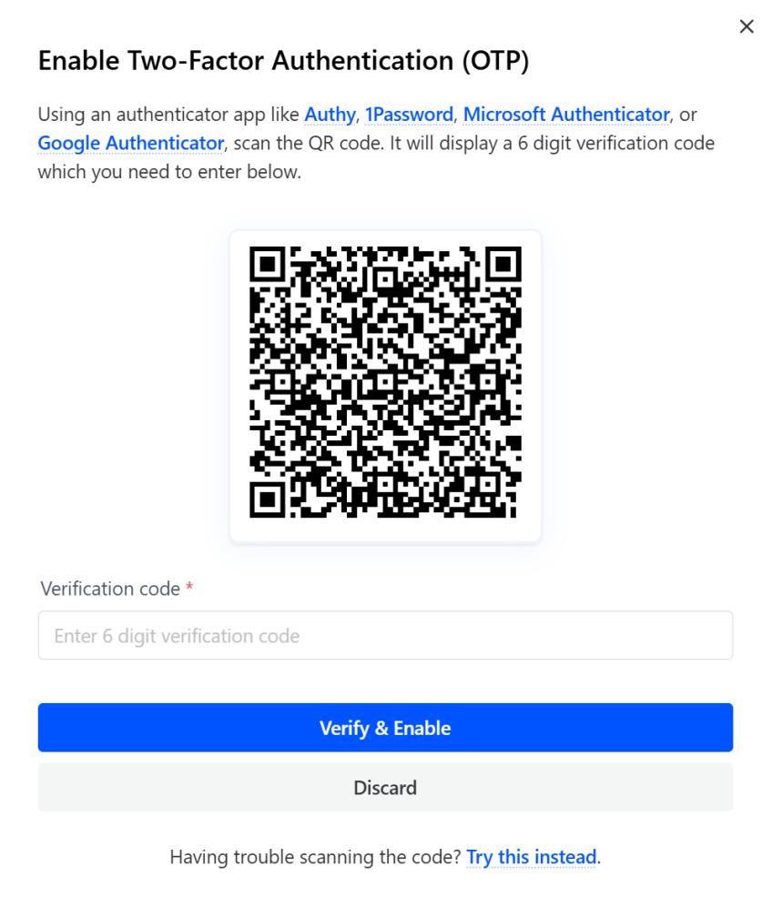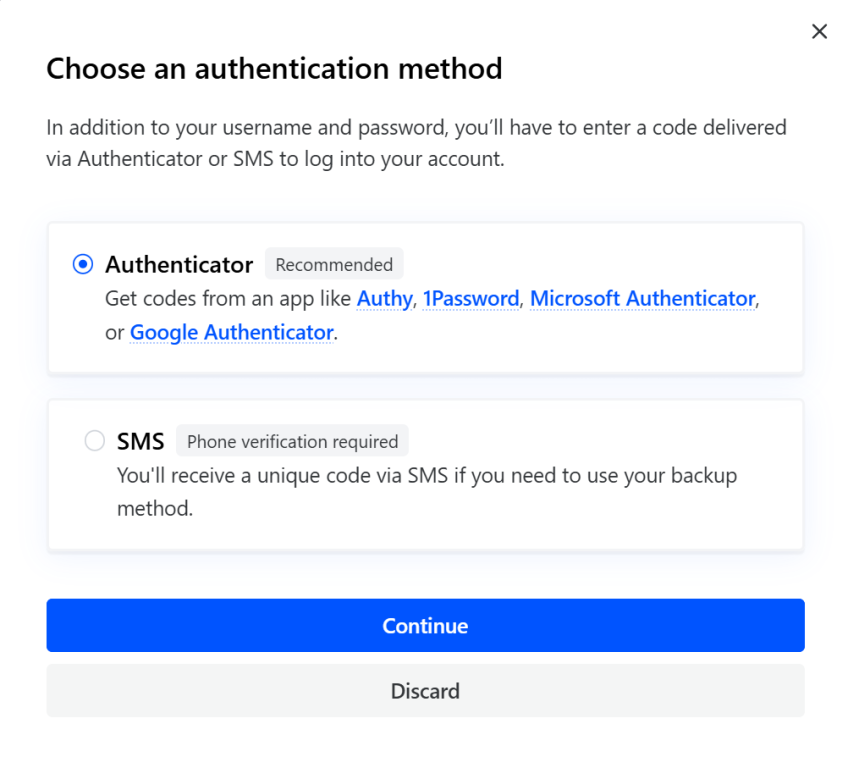 To use an authenticator, you must install and set up a trusted authenticator app such as Authy, Google Authenticator, 1Authenticate, or others. This is the recommended method.