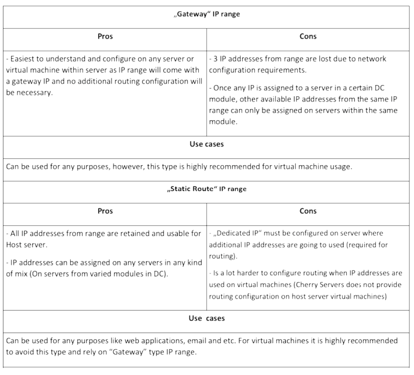 - IP addresses in ranges of 8, 16, 32 or 64 can be ordered per bare metal server (8 IP range only per virtual server);